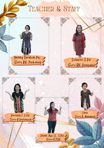 Teacher & Staff Teacher & Staff Yenny Ibrahim,Psi Sulastri,S.Pd Guru BK, Psikolog Guru BK. Konselor Liana Berliana T.,S.Pd Guru B. Mandarin Guru B.Indonesia Indah Ayu O., S.Pd Guru PJOK